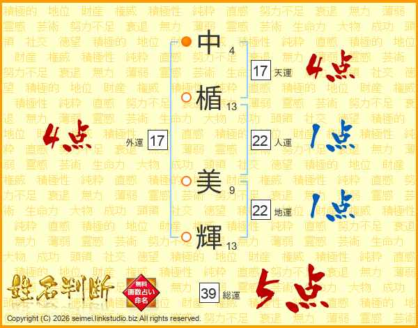 中楯美輝さんの総運は39画の5点!