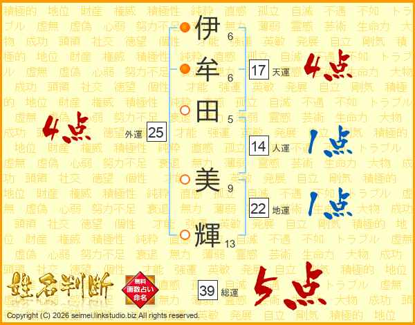 伊(6画)牟(6画)田(5画) 美(9画)輝(13画)