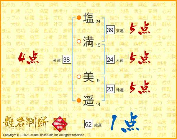 塩(24画)満(15画) 美(9画)遥(14画)