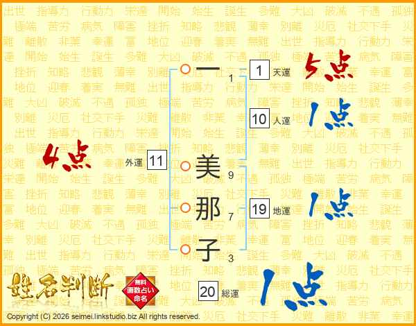 生活面を象徴する運勢です。外部から受ける影響力を表し、結婚運、家庭運や職場、環境への順応性を表します。総運から人運を引いた画数。姓や名が1文字の場合を除く。