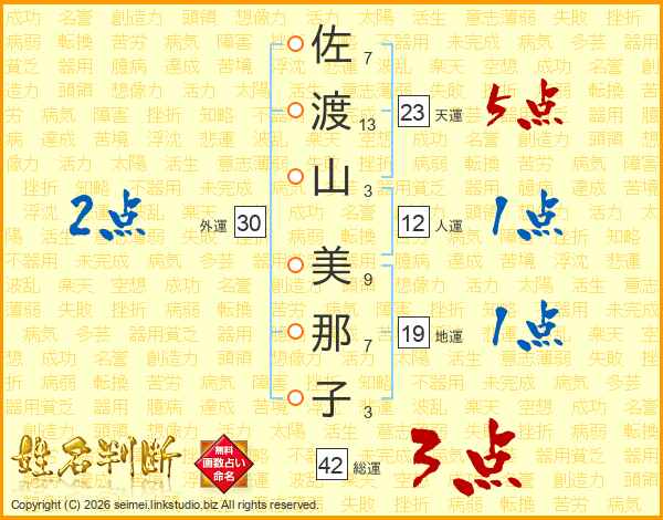 佐(7画)渡(13画)山(3画) 美(9画)那(7画)子(3画)