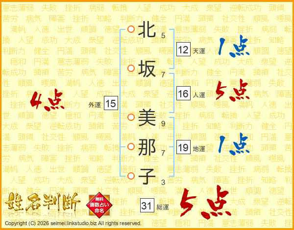 北(5画)坂(7画) 美(9画)那(7画)子(3画)