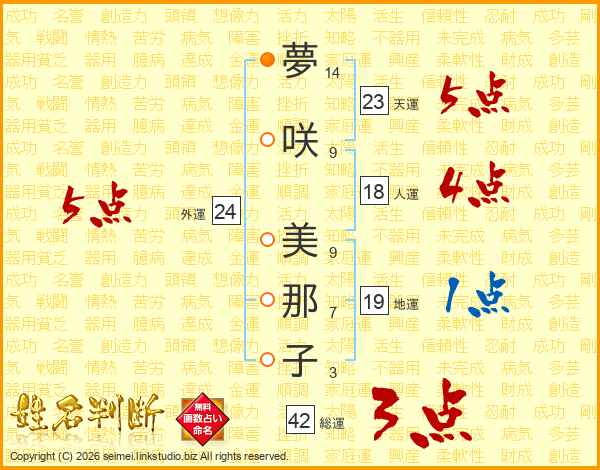 夢(14画)咲(9画) 美(9画)那(7画)子(3画)