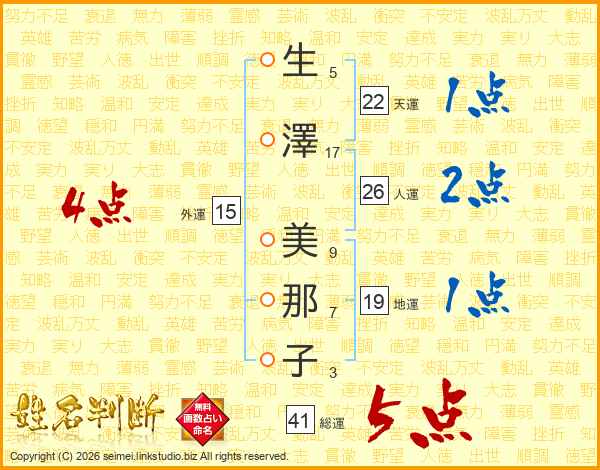 生(5画)澤(17画) 美(9画)那(7画)子(3画)