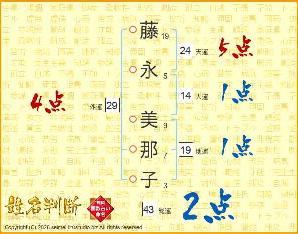 藤(19画)永(5画) 美(9画)那(7画)子(3画)
