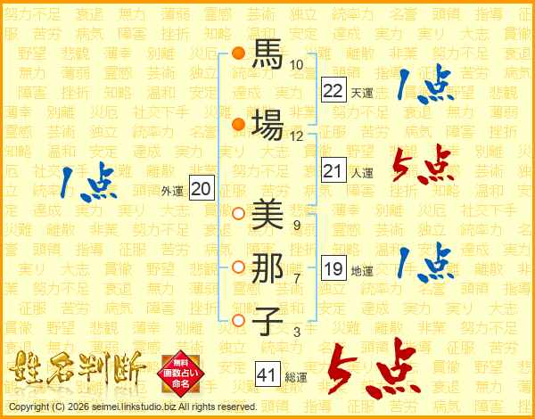馬(10画)場(12画) 美(9画)那(7画)子(3画)