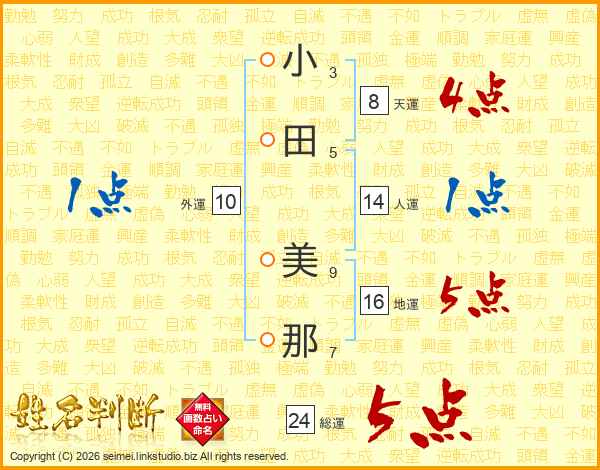 生活面を象徴する運勢です。外部から受ける影響力を表し、結婚運、家庭運や職場、環境への順応性を表します。総運から人運を引いた画数。姓や名が1文字の場合を除く。
