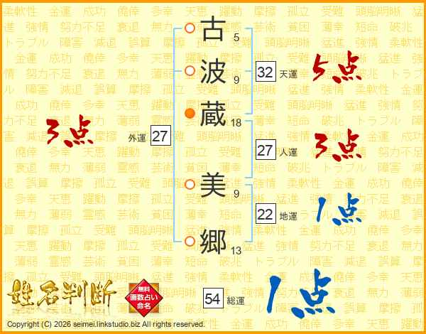 古(5画)波(9画)蔵(18画) 美(9画)郷(13画)
