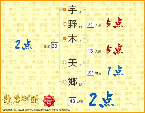 宇野木美郷さんの天運は21画の5点!
