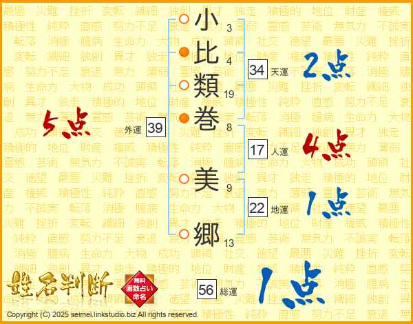小(3画)比(4画)類(19画)巻(8画) 美(9画)郷(13画)