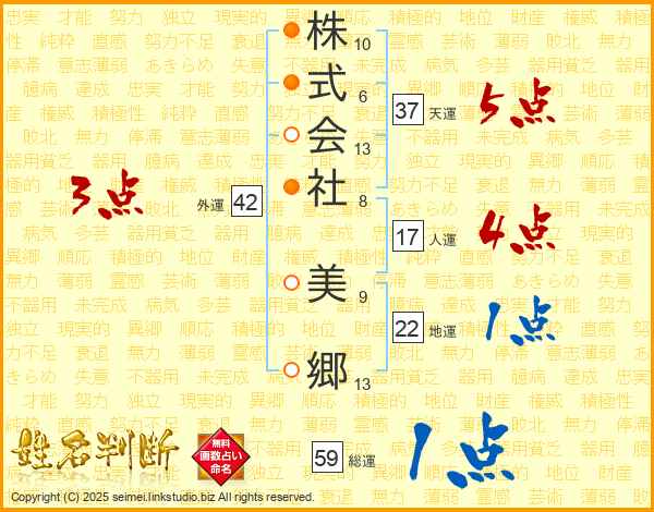 株(10画)式(6画)会(13画)社(8画) 美(9画)郷(13画)