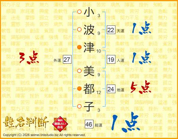 小(3画)波(9画)津(10画) 美(9画)都(12画)子(3画)