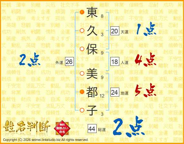 東(8画)久(3画)保(9画) 美(9画)都(12画)子(3画)