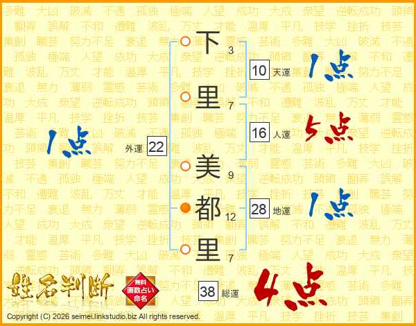 下里美都里さんの総運は38画の4点!