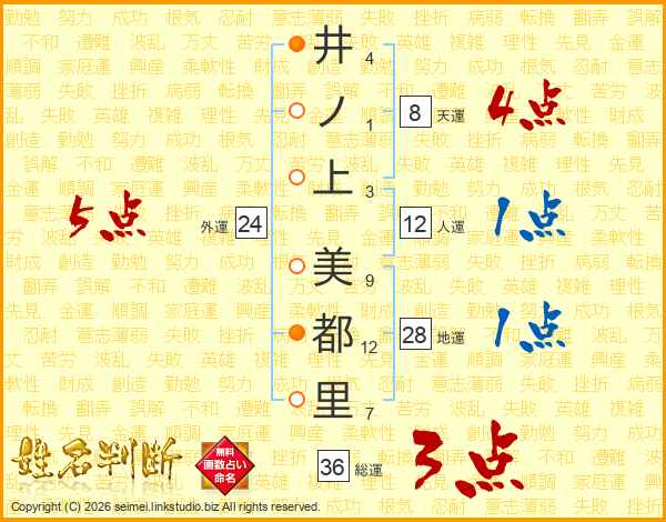 井(4画)ノ(1画)上(3画) 美(9画)都(12画)里(7画)