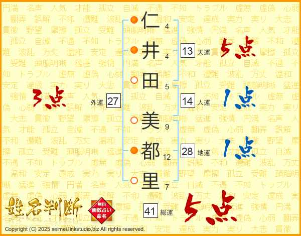 仁(4画)井(4画)田(5画) 美(9画)都(12画)里(7画)