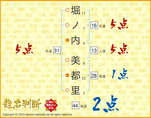 堀(11画)ノ(1画)内(4画) 美(9画)都(12画)里(7画)