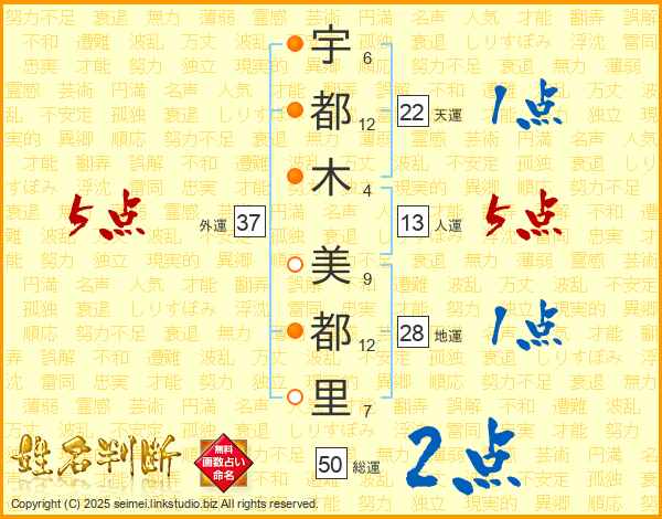 宇(6画)都(12画)木(4画) 美(9画)都(12画)里(7画)