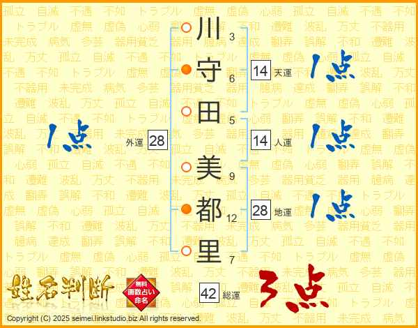 川(3画)守(6画)田(5画) 美(9画)都(12画)里(7画)