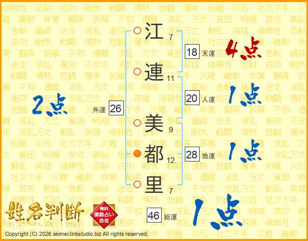 江(7画)連(11画) 美(9画)都(12画)里(7画)