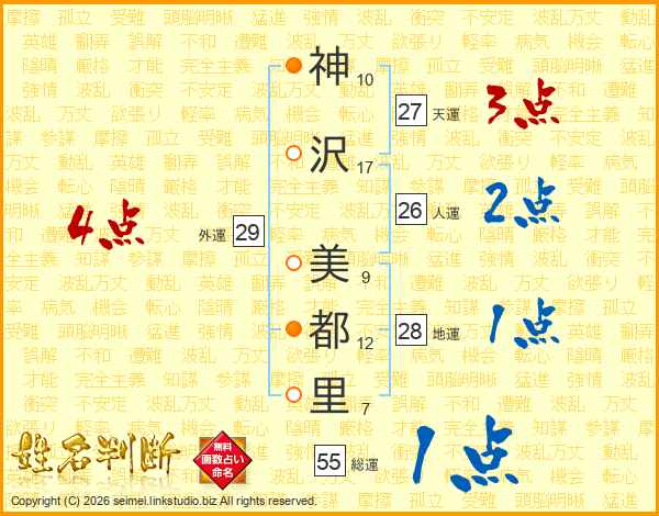 神(10画)沢(17画) 美(9画)都(12画)里(7画)