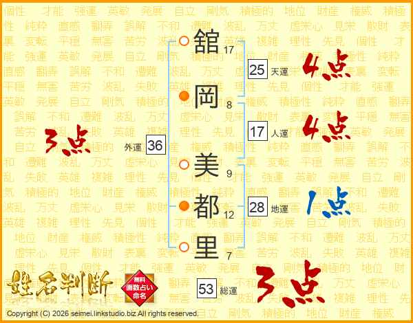 舘(17画)岡(8画) 美(9画)都(12画)里(7画)