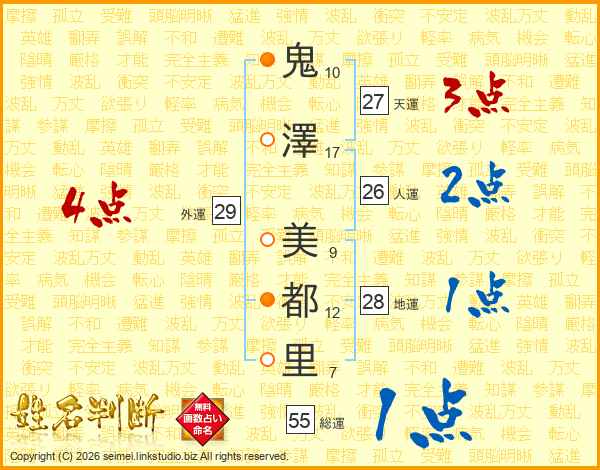 鬼(10画)澤(17画) 美(9画)都(12画)里(7画)