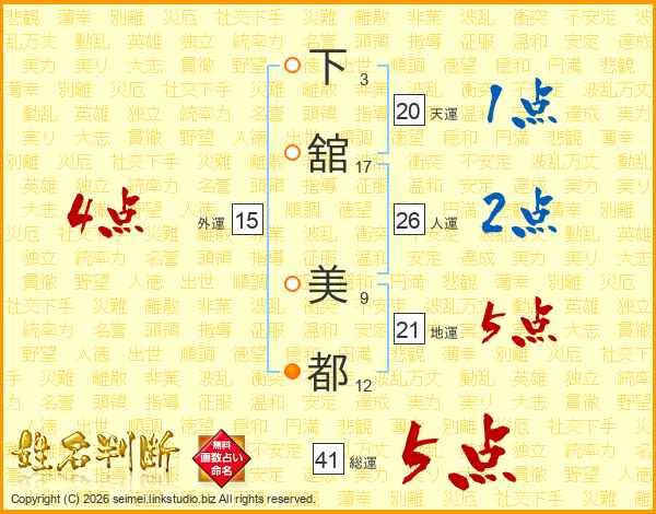 生活面を象徴する運勢です。外部から受ける影響力を表し、結婚運、家庭運や職場、環境への順応性を表します。総運から人運を引いた画数。姓や名が1文字の場合を除く。