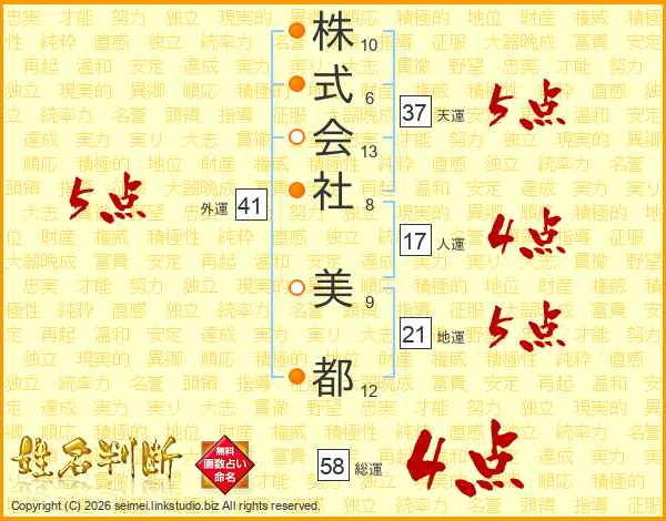 株(10画)式(6画)会(13画)社(8画) 美(9画)都(12画)