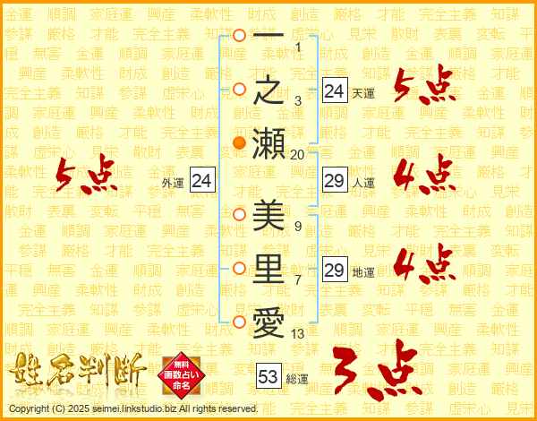 一(1画)之(3画)瀬(20画) 美(9画)里(7画)愛(13画)