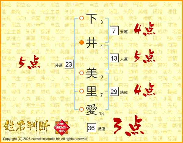 下(3画)井(4画) 美(9画)里(7画)愛(13画)