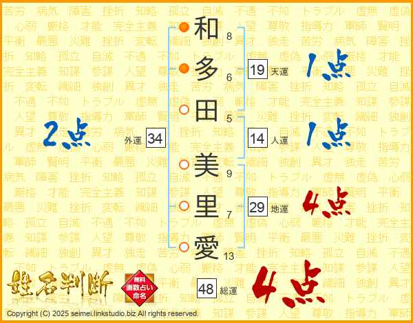 和(8画)多(6画)田(5画) 美(9画)里(7画)愛(13画)