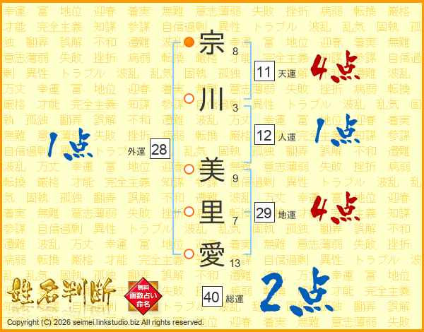 宗川美里愛さんの総運は40画の2点!