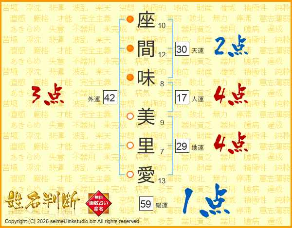 座(10画)間(12画)味(8画) 美(9画)里(7画)愛(13画)