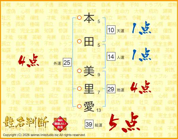 本田美里愛さんの総運は39画の5点!