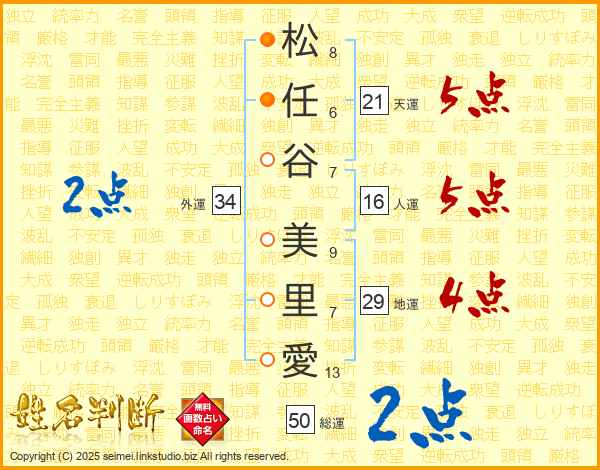 松(8画)任(6画)谷(7画) 美(9画)里(7画)愛(13画)