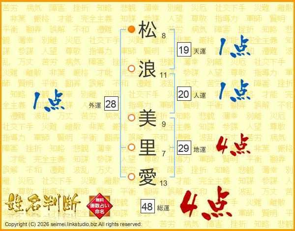松(8画)浪(11画) 美(9画)里(7画)愛(13画)