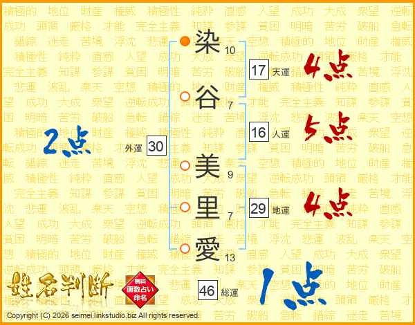 染(10画)谷(7画) 美(9画)里(7画)愛(13画)