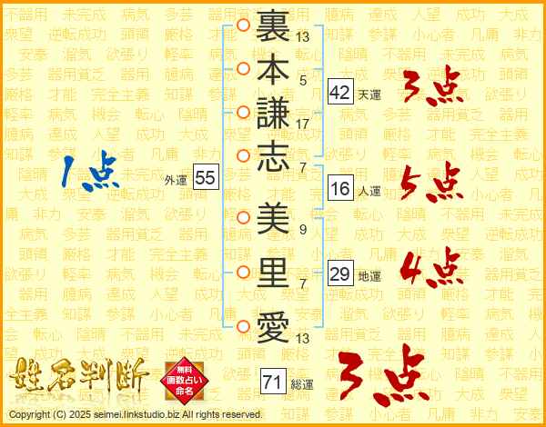 裏(13画)本(5画)謙(17画)志(7画) 美(9画)里(7画)愛(13画)