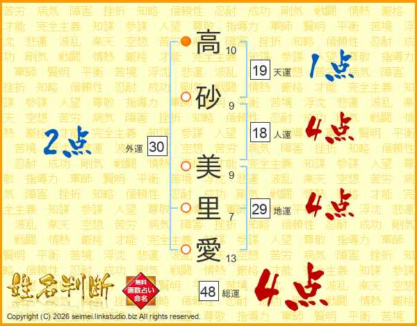 高(10画)砂(9画) 美(9画)里(7画)愛(13画)