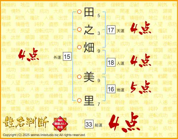 田(5画)之(3画)畑(9画) 美(9画)里(7画)