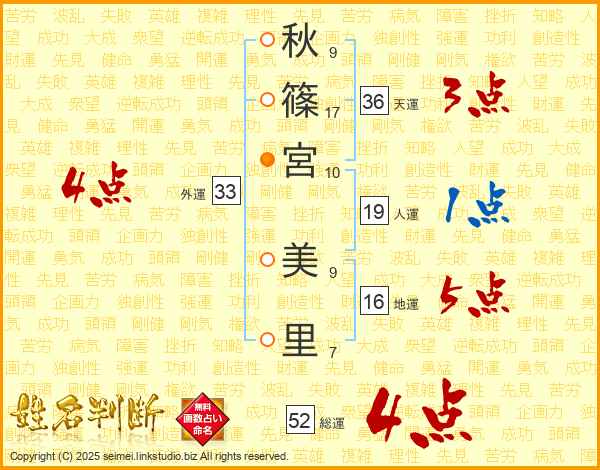 秋(9画)篠(17画)宮(10画) 美(9画)里(7画)