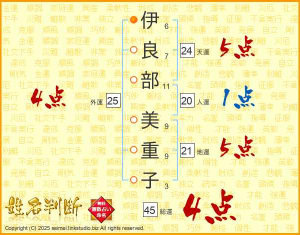 伊(6画)良(7画)部(11画) 美(9画)重(9画)子(3画)