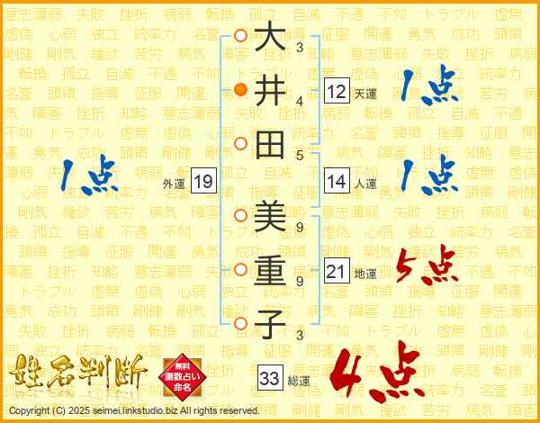 大(3画)井(4画)田(5画) 美(9画)重(9画)子(3画)
