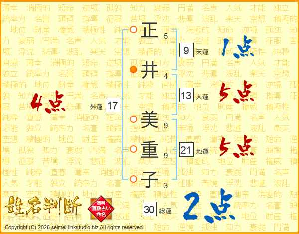 正(5画)井(4画) 美(9画)重(9画)子(3画)