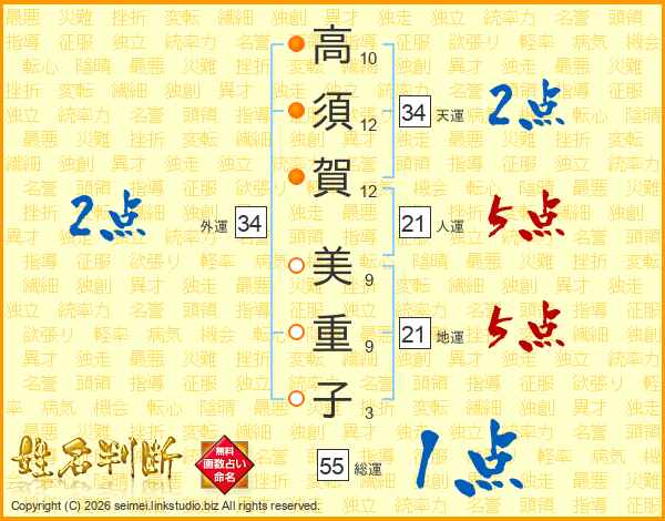 高(10画)須(12画)賀(12画) 美(9画)重(9画)子(3画)