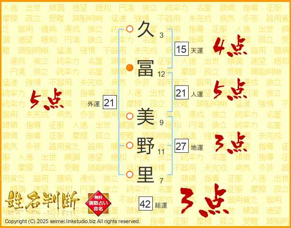 久(3画)冨(12画) 美(9画)野(11画)里(7画)