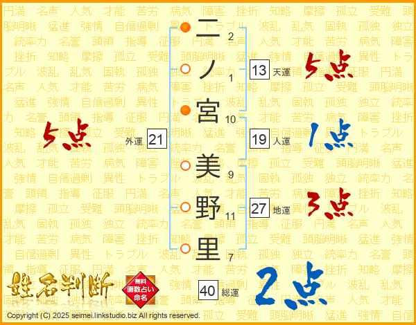 二(2画)ノ(1画)宮(10画) 美(9画)野(11画)里(7画)