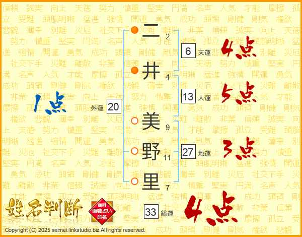 二(2画)井(4画) 美(9画)野(11画)里(7画)