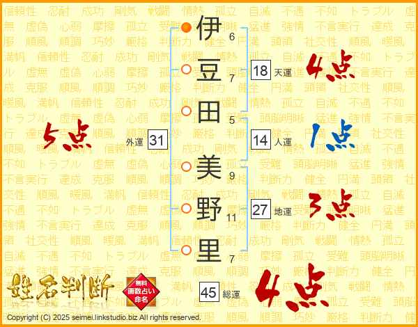 伊(6画)豆(7画)田(5画) 美(9画)野(11画)里(7画)
